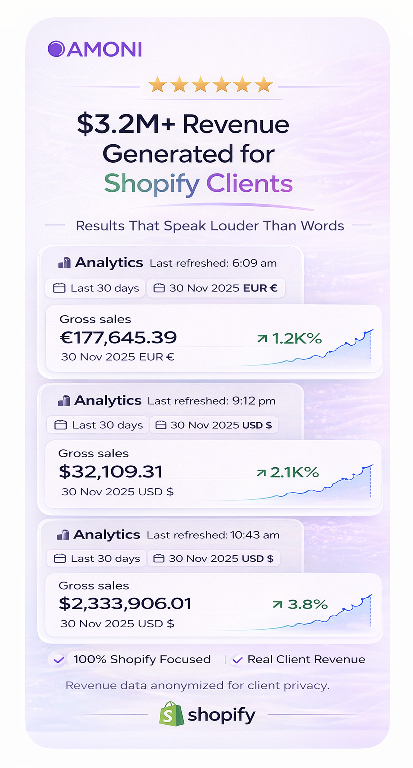 Want to set up a solid online store that really shows off your brand? Amoni is a trusted Shopify development company that focuses on creating smooth and effective Shopify websites that fit your business needs. Our experienced team offers flexible e-commerce solutions, custom website designs, and everything else you need to succeed online, no matter how long you’ve been in business.